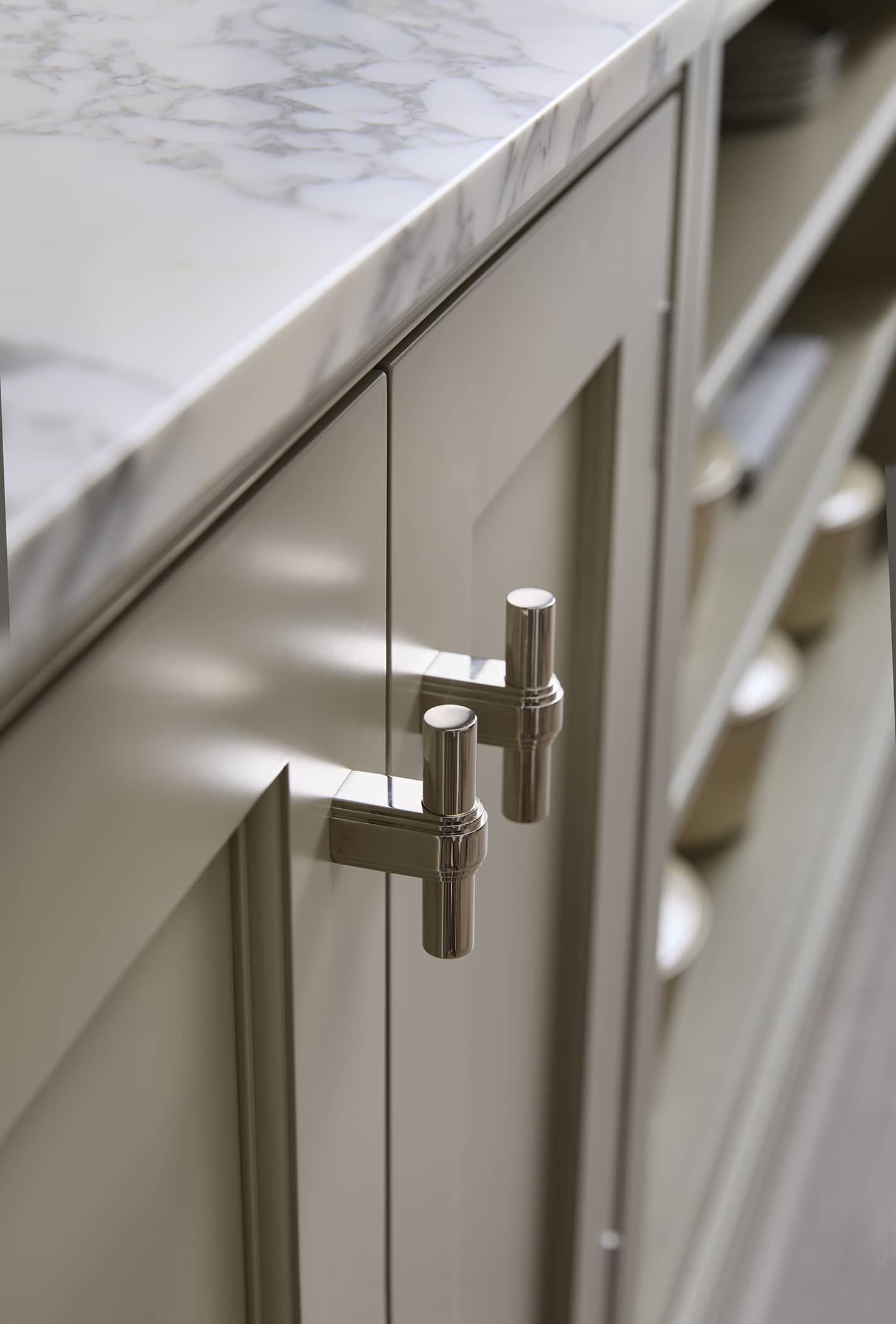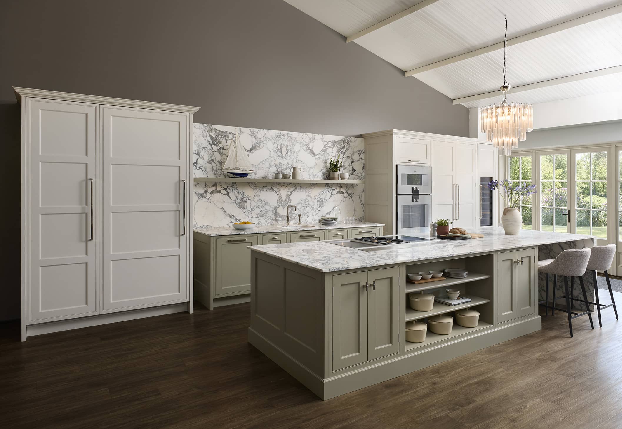 This truly hand-built, in-frame beaded shaker kitchen exemplifies timeless craftsmanship. Finished in elegant Farrow & Ball French Grey, our bespoke cabinetry features refined panel detailing that adds depth and character. The result is a meticulously curated space that balances enduring beauty with effortless functionality