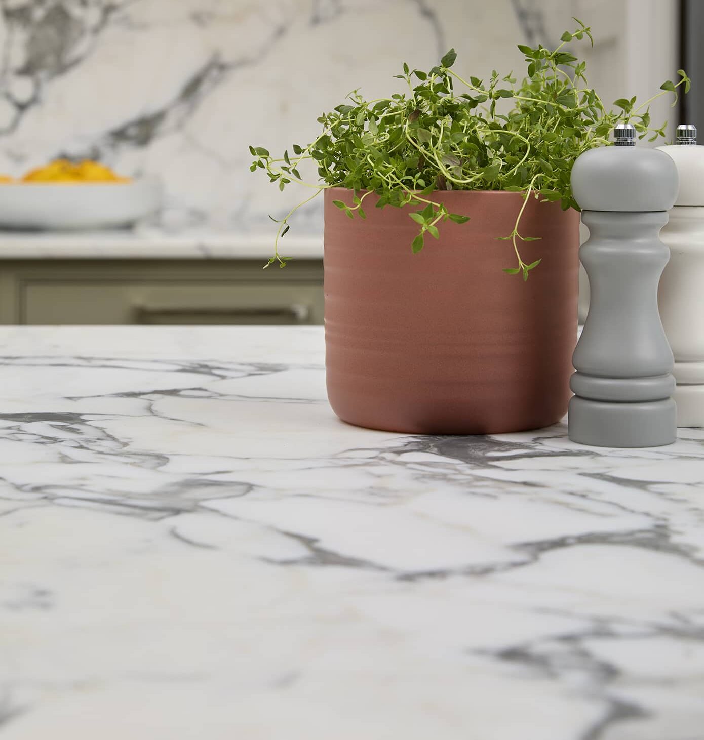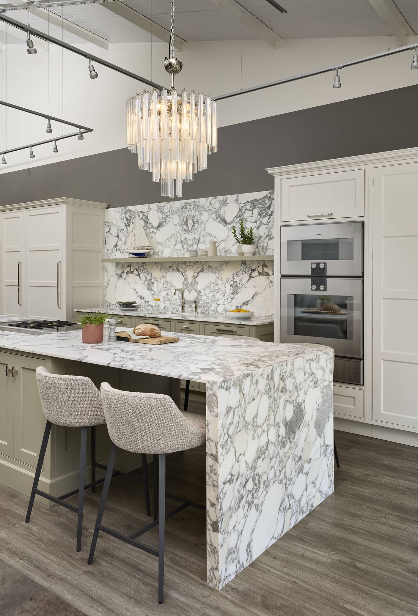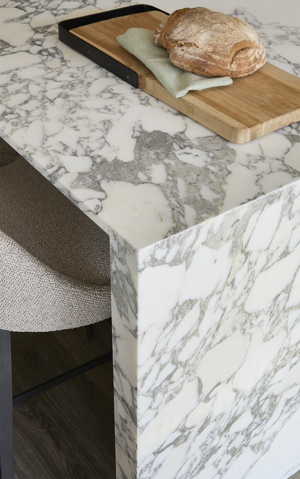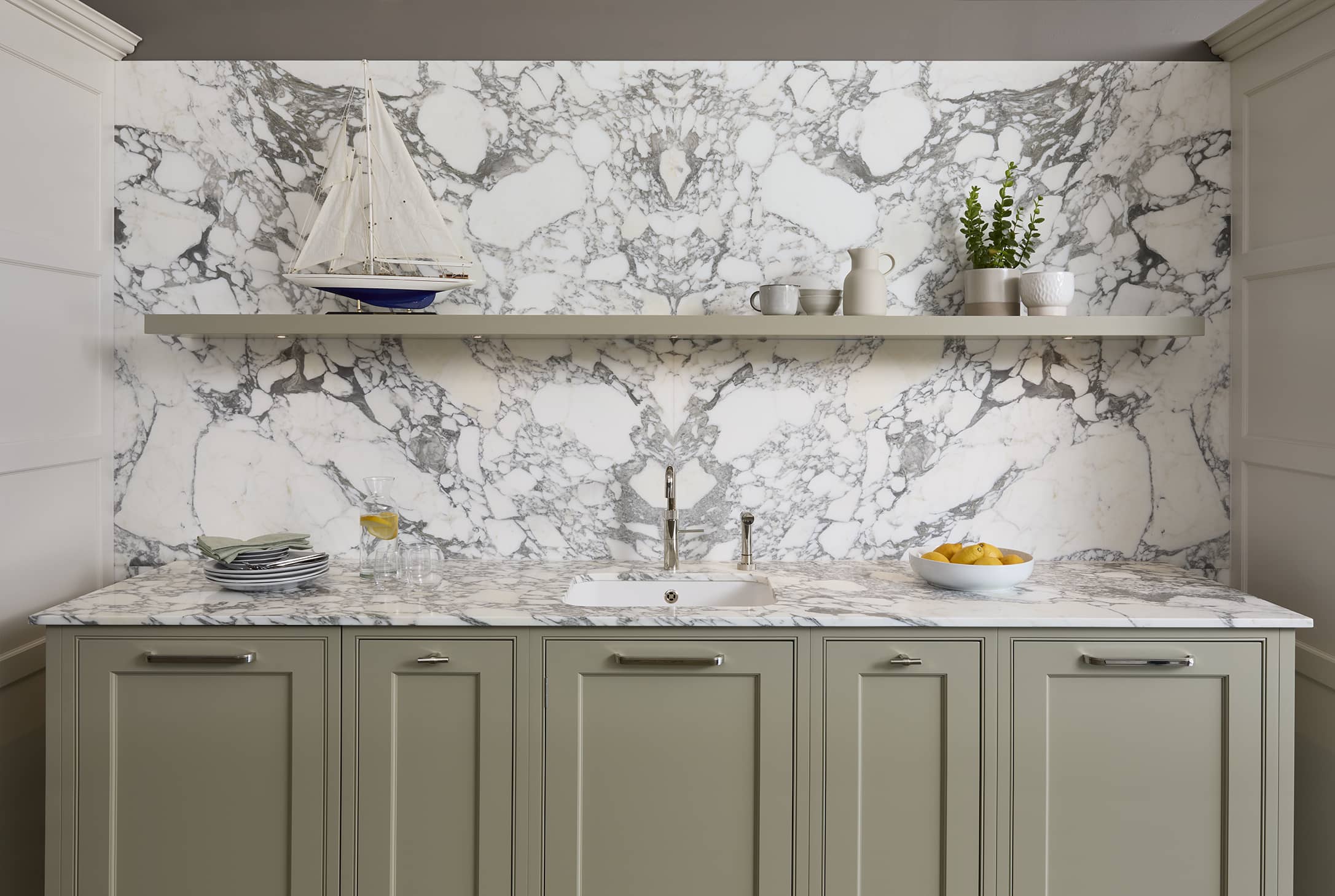 The Calacatta Corchia marble worktop, with its sweeping, dramatic veining and rich tonal variation of soft greys and warm golds, serves as the centrepiece of the space. Its natural elegance elevate the entire kitchen, bringing a sense of quiet opulence that is both striking and serene.